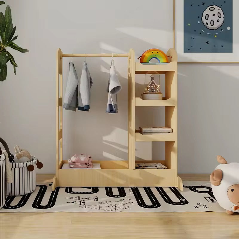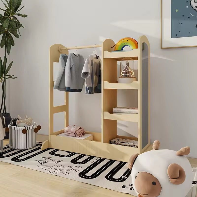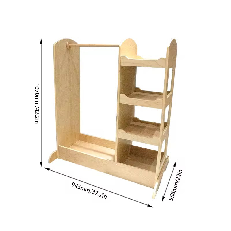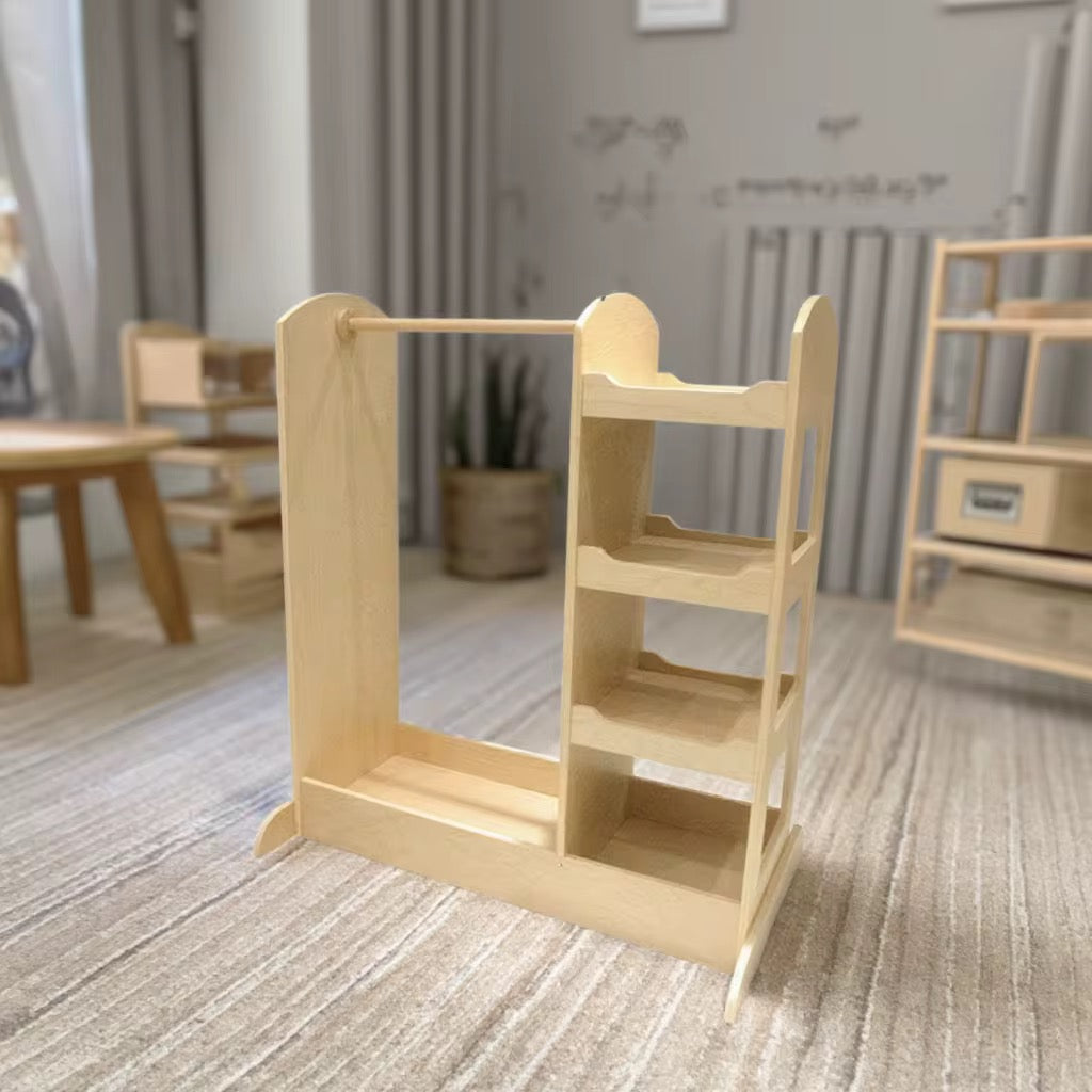 საბავშვო ხის ტანსაცმლის საკიდი თაროებით – მონტესორის სტილი