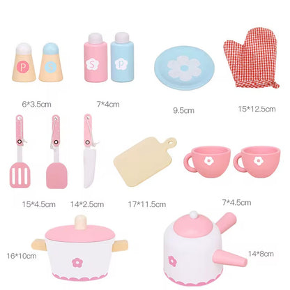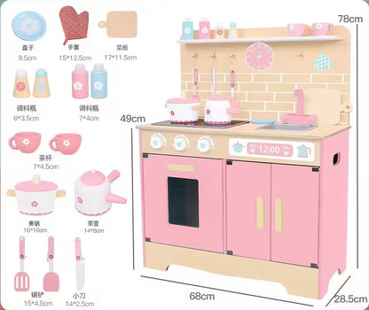 ვარდისფერი ხის სათამაშო სამზარეულო