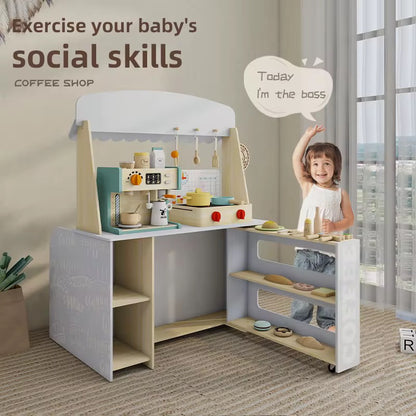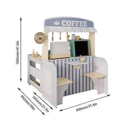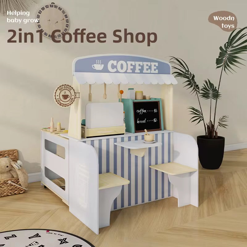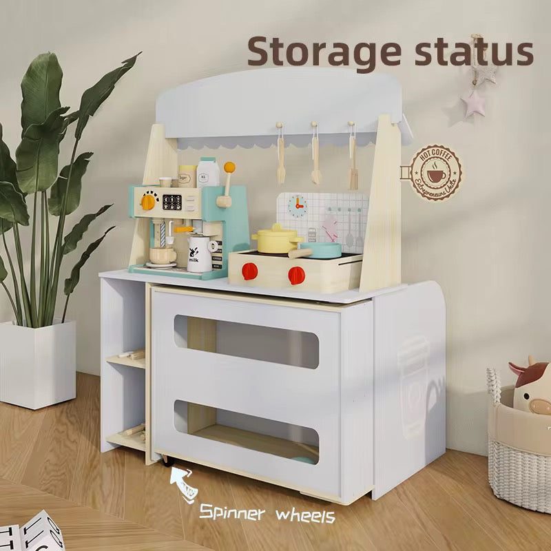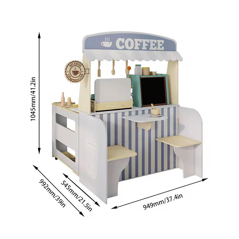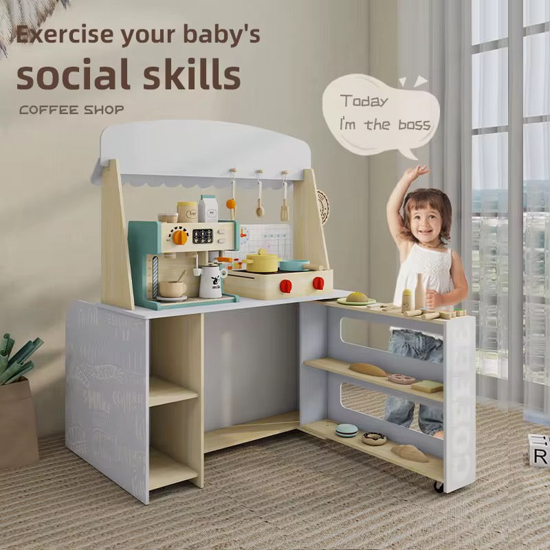 ეს მრავალფუნქციური სათამაშო სამზარეულო-კაფე შექმნილია იმისთვის, რომ ბავშვებმა გააცოცხლონ თავიანთი წარმოსახვა და ითამაშონ “როლური თამაშები”, როგორც პატარა შეფ-მზარეულებმა ან ბარისტებმა.