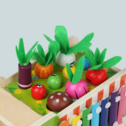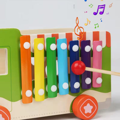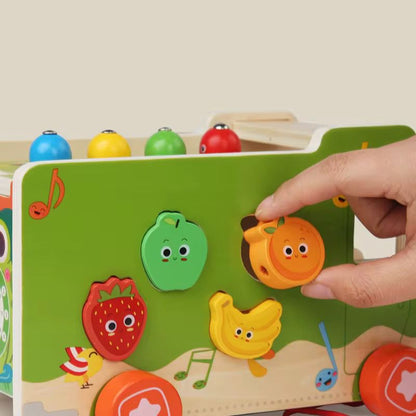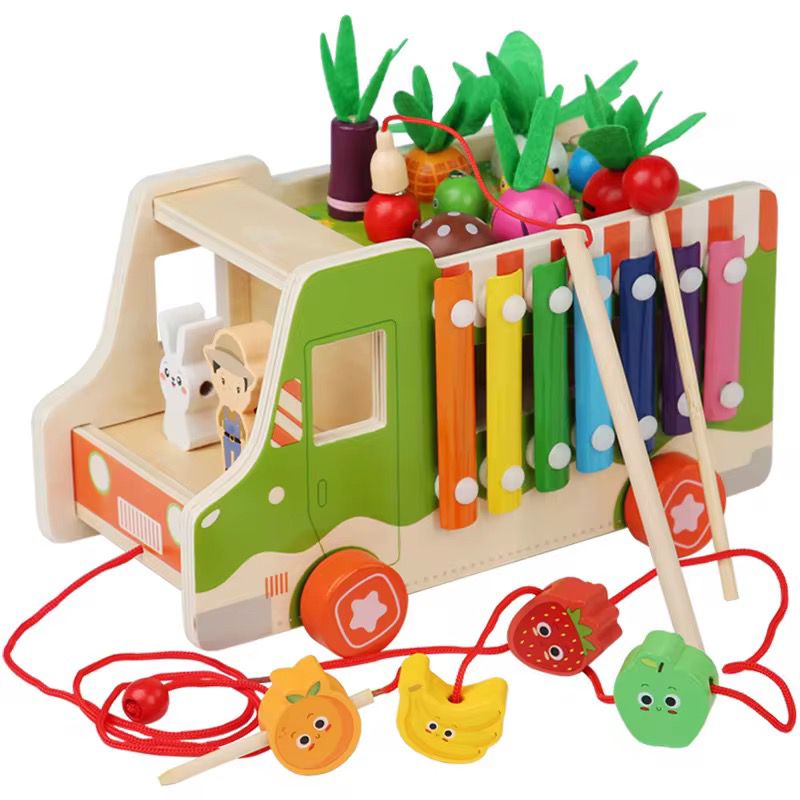 ხის მანქანა ხილ-ბოსტნეულის ნაკრებით და ქსილოფონით
