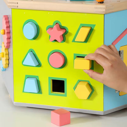 სურათზე ჩანს მრავალფუნქციური, ოთხწახნაგოვანი ხის საგანმანათლებლო სათამაშო ბავშვებისთვის, რომლის განზომილებებია: სიმაღლე 51 სმ და სიგანე 41.5 სმ.