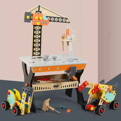 სათამაშო სამუშაო მაგიდა ამწე ამწითა და სატვირთო მანქანით
